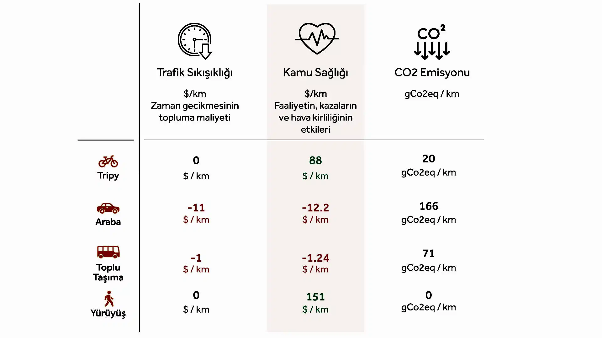Ortalama bir Tripy seyahati olan 8 km’lik bir yolculukla, kendinize ve topluma 119.1 TL kazandırırsınız. Örneğin, kanser, diyabet gibi hastalıkların riskini azaltırsınız ve trafik sıkışıklığını en aza indirip, fosil yakıt kullanmadan hava kirliliğini azaltmaya katkıda bulunursunuz.